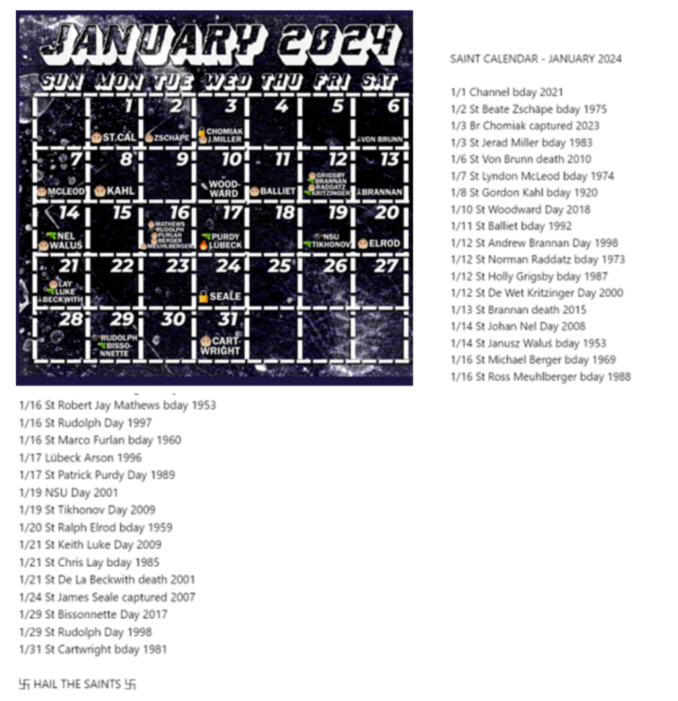 Les communautés accélérationnistes s’organisent sur Telegram au sein d’un réseau informel de chaînes souvent identifiées comme « Terrorgram », où elles publient des calendriers mensuels désignant des jours spécifiques à des terroristes suprémacistes blancs. Des icônes symboliques sur le calendrier représentent la nature de la commémoration. Les gâteaux représentent les anniversaires ; les runes de mort marquent ceux qui sont décédés de leur propre main, des mains des forces de l’ordre ou de la peine capitale ; et les cadenas indiquent la capture et l’incarcération. Les jours où des attentats ont été commis sont signalés par des bombes ou des armes spécifiques indiquant le mode d’attaque. Ces calendriers sont accompagnés d’une liste énumérant ces « saints » avec la signature traditionnelle du pouvoir blanc « Hail Victory » (traduction anglaise du célèbre salut nazi « Sieg Heil ») convertie en « Hail the Saints » et ornée de croix gammées.